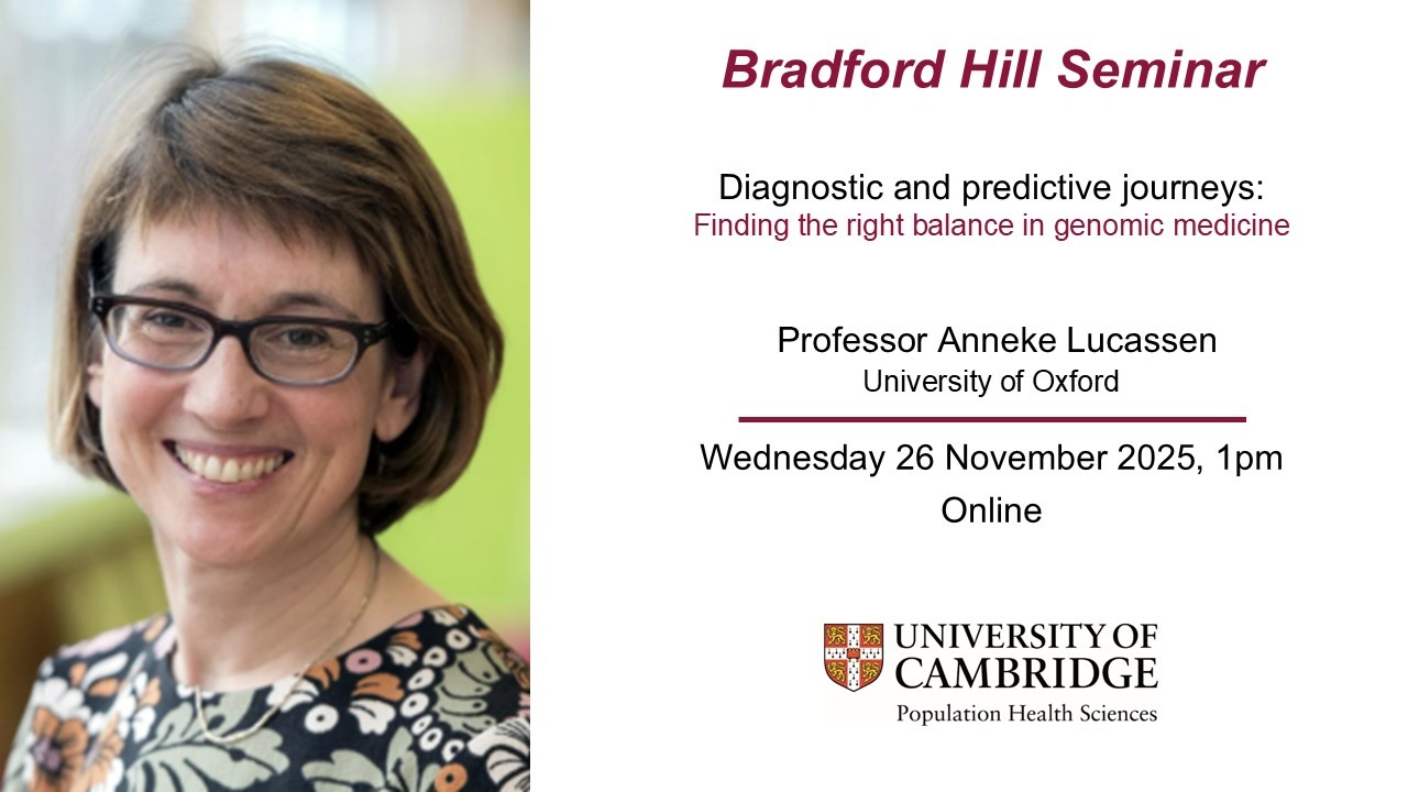 The Bradford Hill seminar series is the principal series of The Cambridge Population Health Sciences Partnership, in collaboration with the PHG Foundation. This comprises the Departments of Public Health & Primary Care, MRC Biostatistics Unit and MRC Epidemiology Unit at the University of Cambridge, bringing together a multi-disciplinary partnership of academics and public health professionals. The Bradford Hill seminar programme of internationally recognised speakers covers topics of broad interest to our public health research community. It aims to transcend as well as connect the activities of our individual partners.