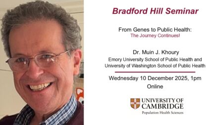 The Bradford Hill seminar series is the principal series of The Cambridge Population Health Sciences Partnership, in collaboration with the PHG Foundation. This comprises the Departments of Public Health & Primary Care, MRC Biostatistics Unit and MRC Epidemiology Unit at the University of Cambridge, bringing together a multi-disciplinary partnership of academics and public health professionals. The Bradford Hill seminar programme of internationally recognised speakers covers topics of broad interest to our public health research community. It aims to transcend as well as connect the activities of our individual partners.